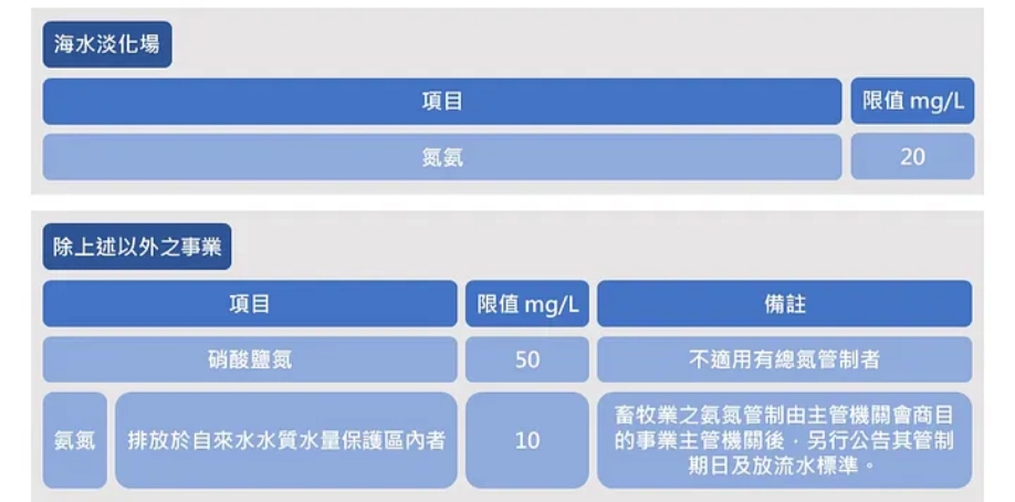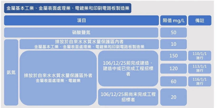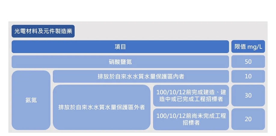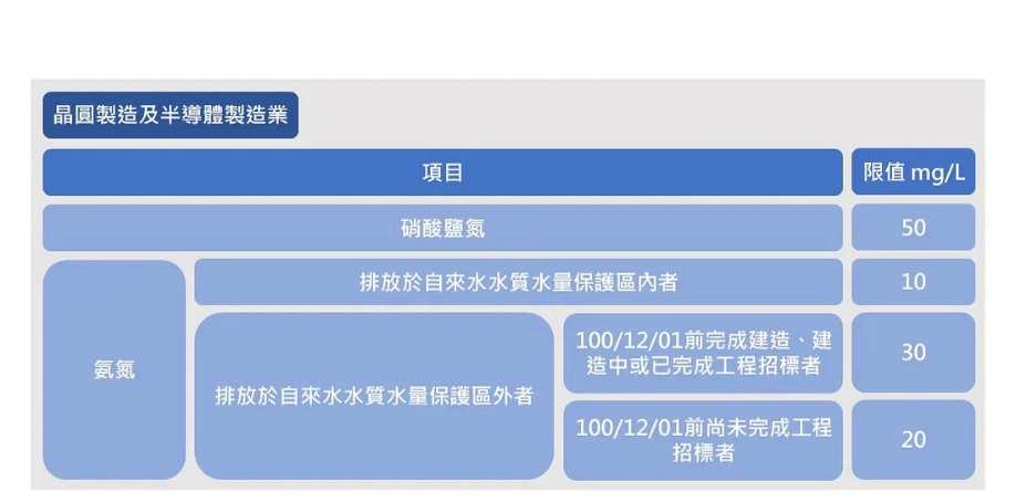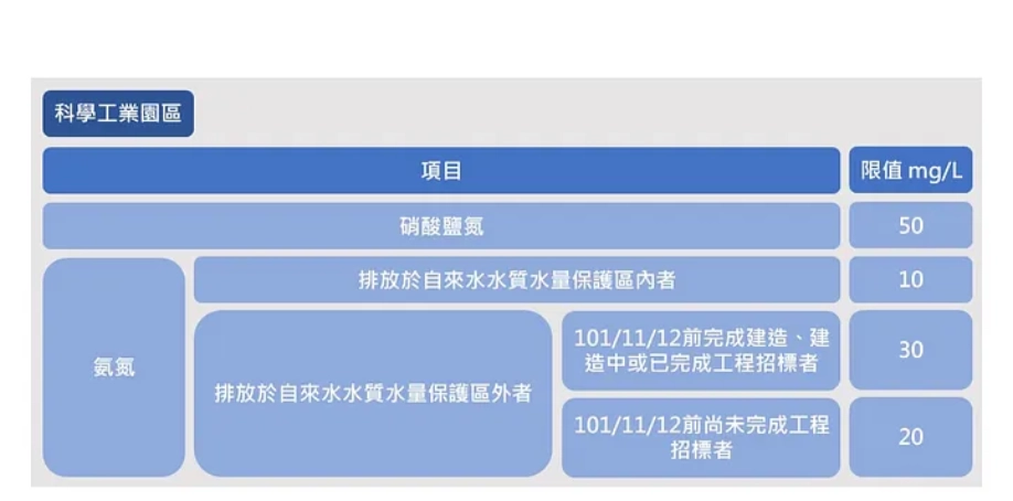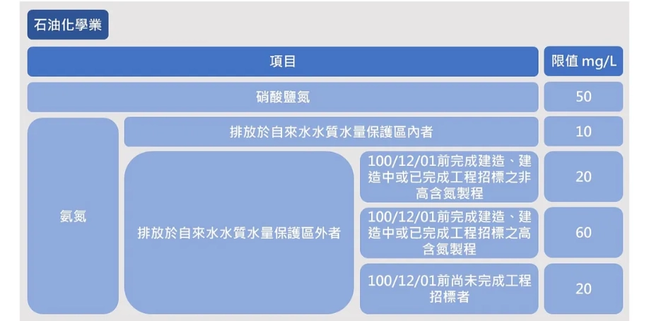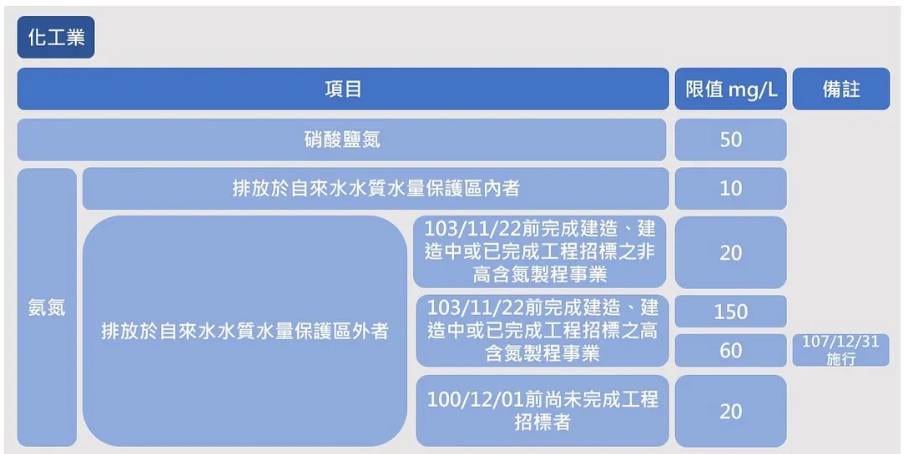 在各產業當中,氨氮的放流水標準各有不同,以下統整了氨氮在各產業當中的限值標準,如圖(二)到圖(九) (附註2 放流水標準-全國法規資料庫)