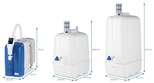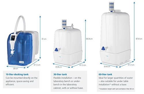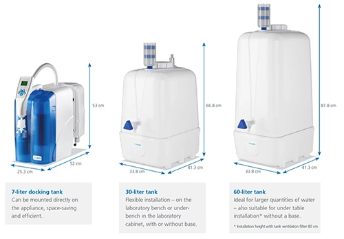 - 多容量儲水:7–100 公升純水儲水槽選配,持續穩定供應 Type II 純水。