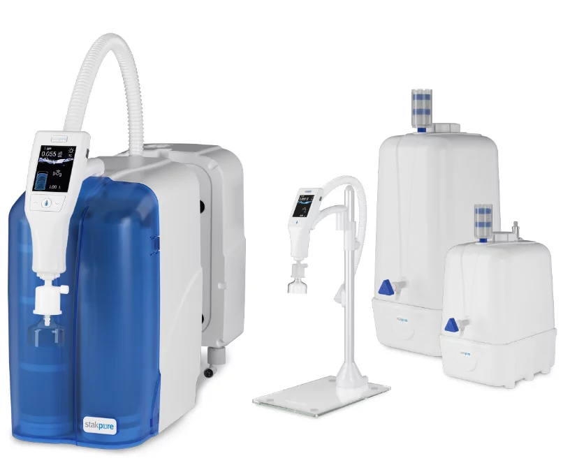 OmniaTap xsbasic 是一款實用型精巧系統,配備 OneHand 單手分注器,適合需少量純水和超純水的實驗室。